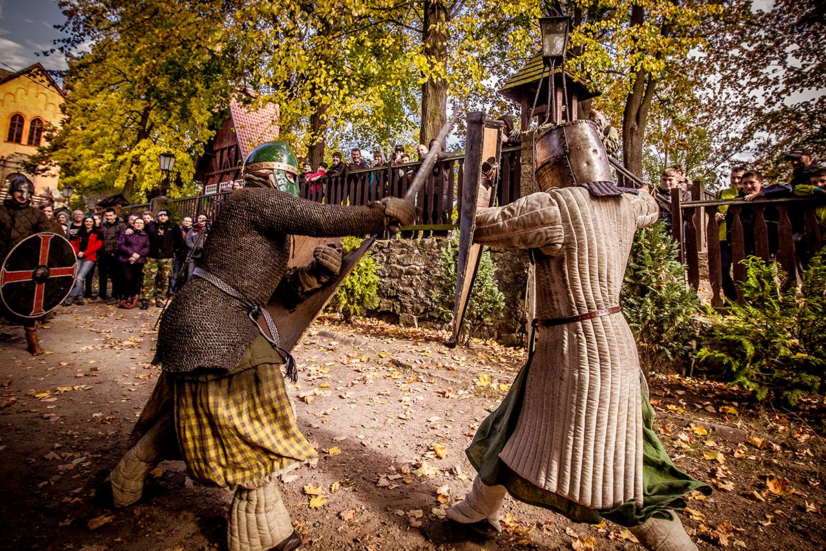 Na placu, przed rycerzami Zakonu, chętni popisywali się swoimi umiejętnościami władania mieczem.